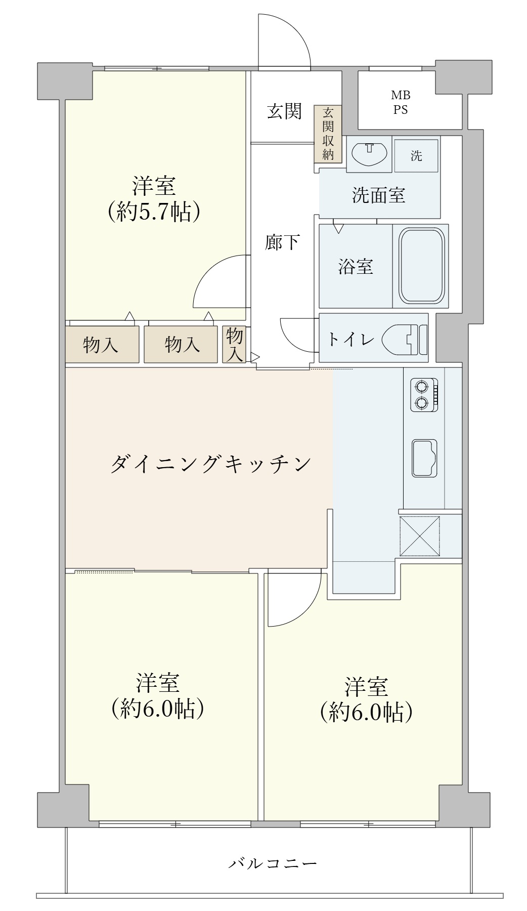 - 約5.7帖の洋室と廊下に収納スペース有