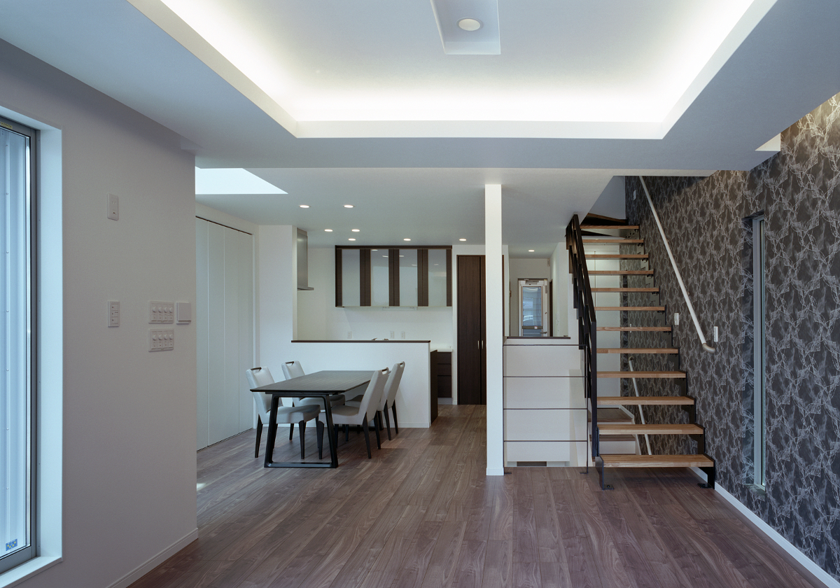 リビングの鉄骨階段が開放的に空間同士を繋ぐ役割を果たしています。