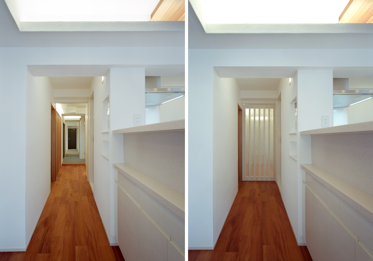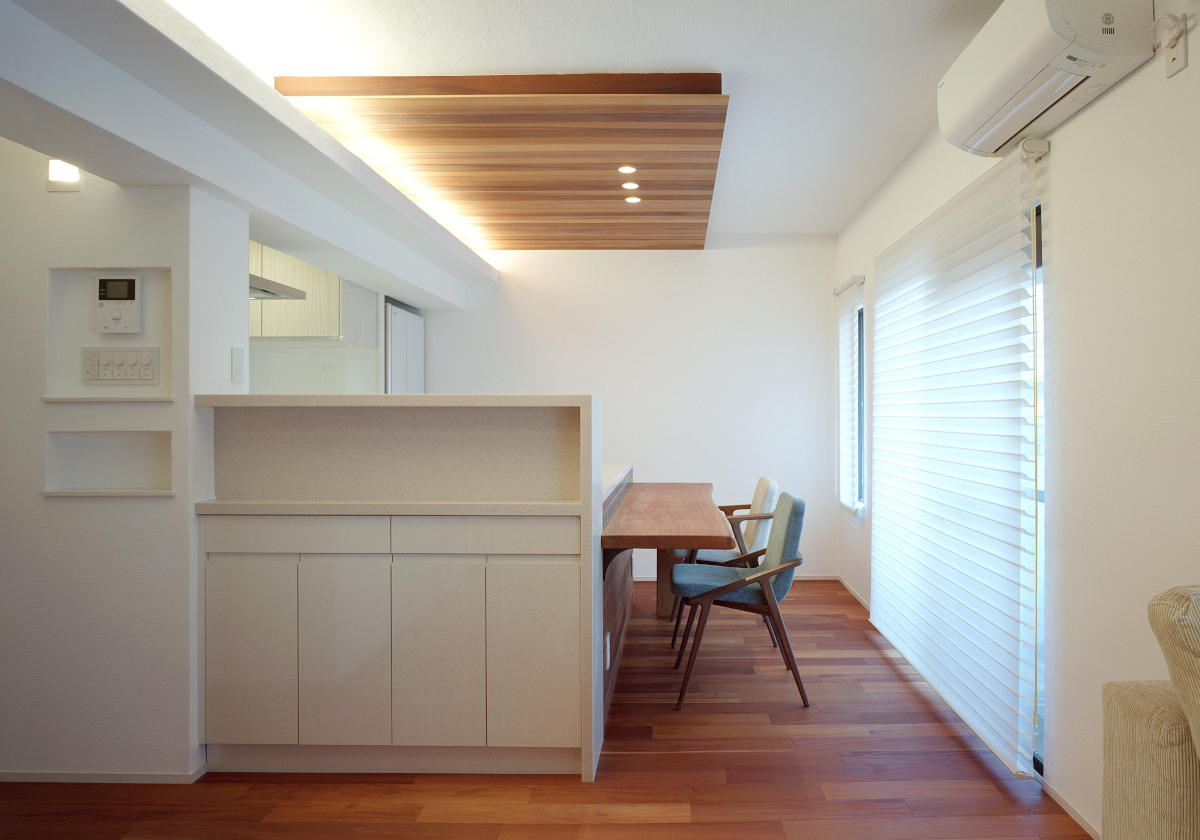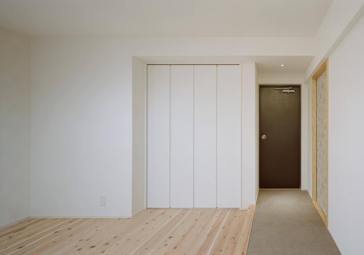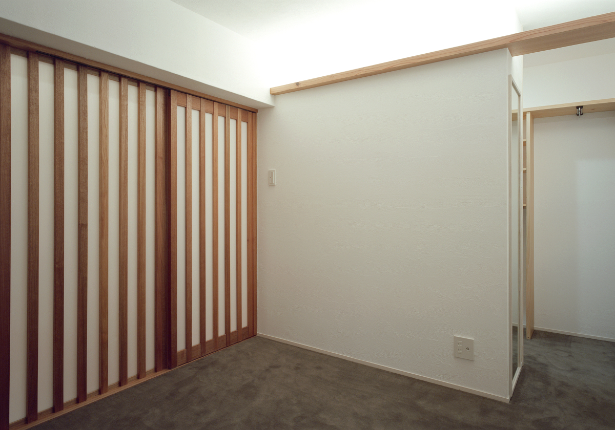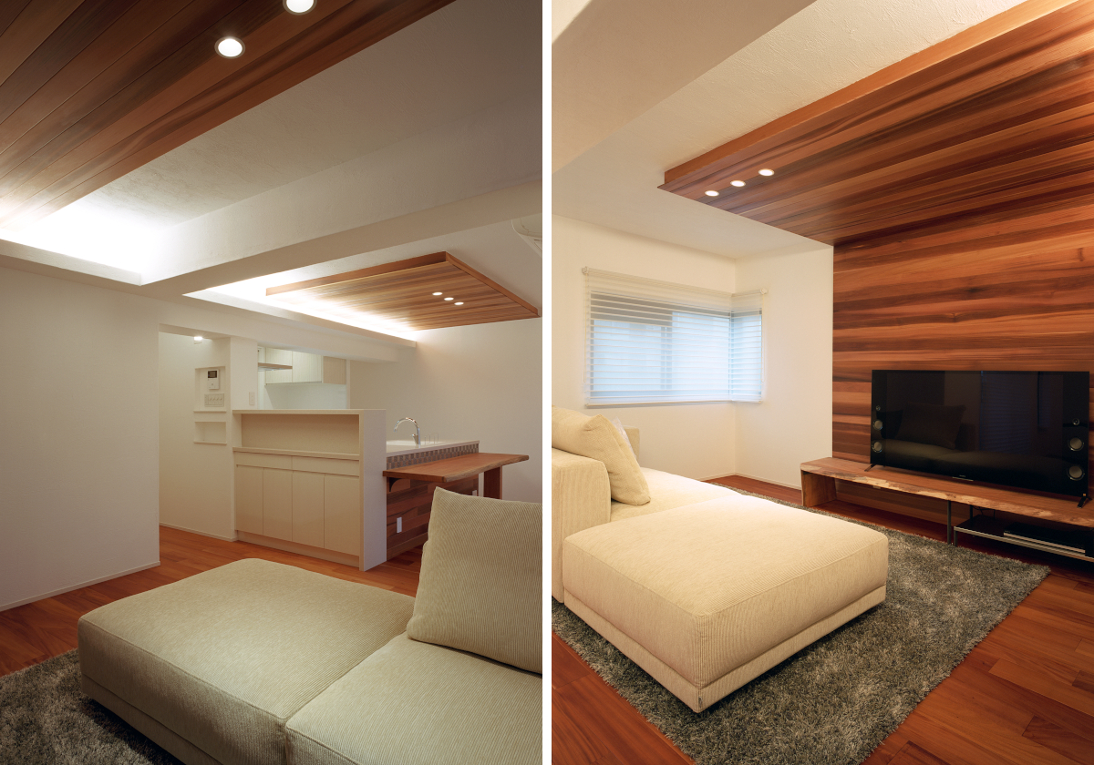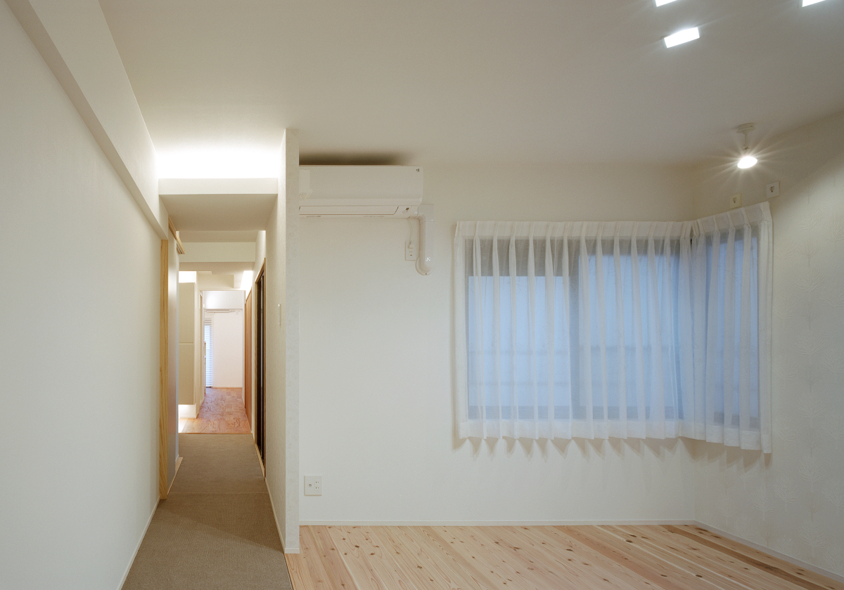 素足で歩く無垢材、絨毯の気持ちよさや、製作建具による室内の統一感、間接照明のライティング手法を取り入れ、断熱補強も施し、全面リフォームだからこそ可能となった例です。