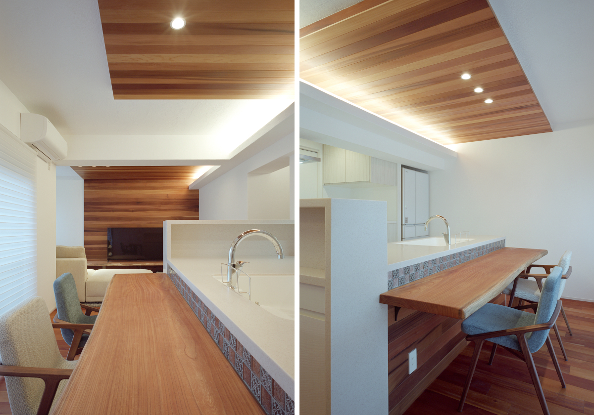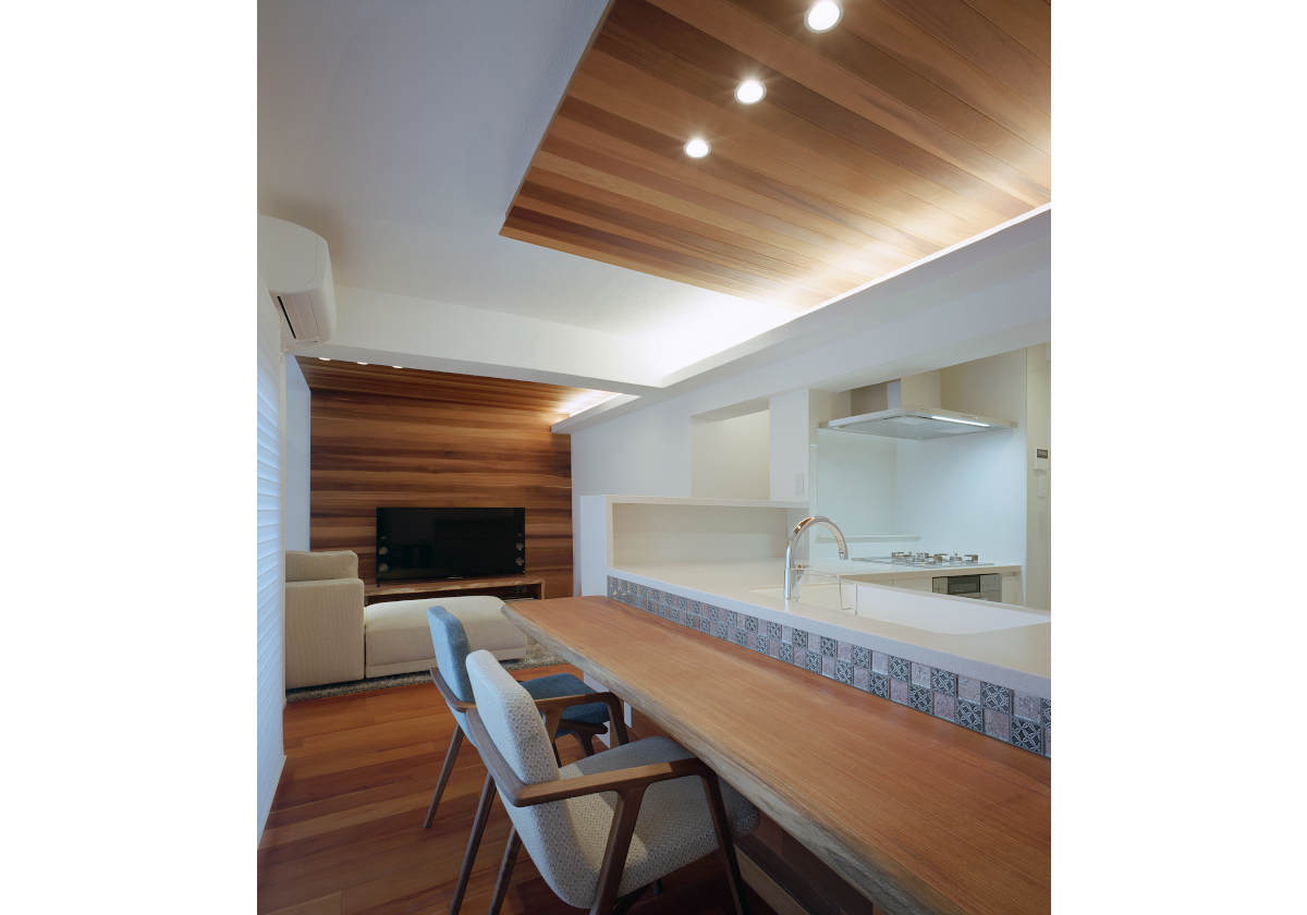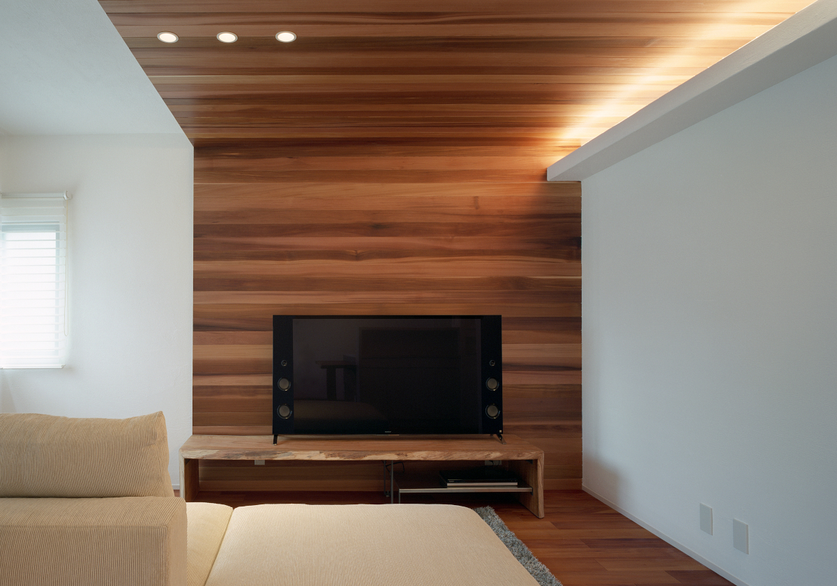 床材、天井材にマホガニー、レッドシダー、天竜杉、マリナムパインなどを使用するとともにしっくい壁の自然材料の質感と合わせることで湿度調整機能を持たせ心地よい空間としました。